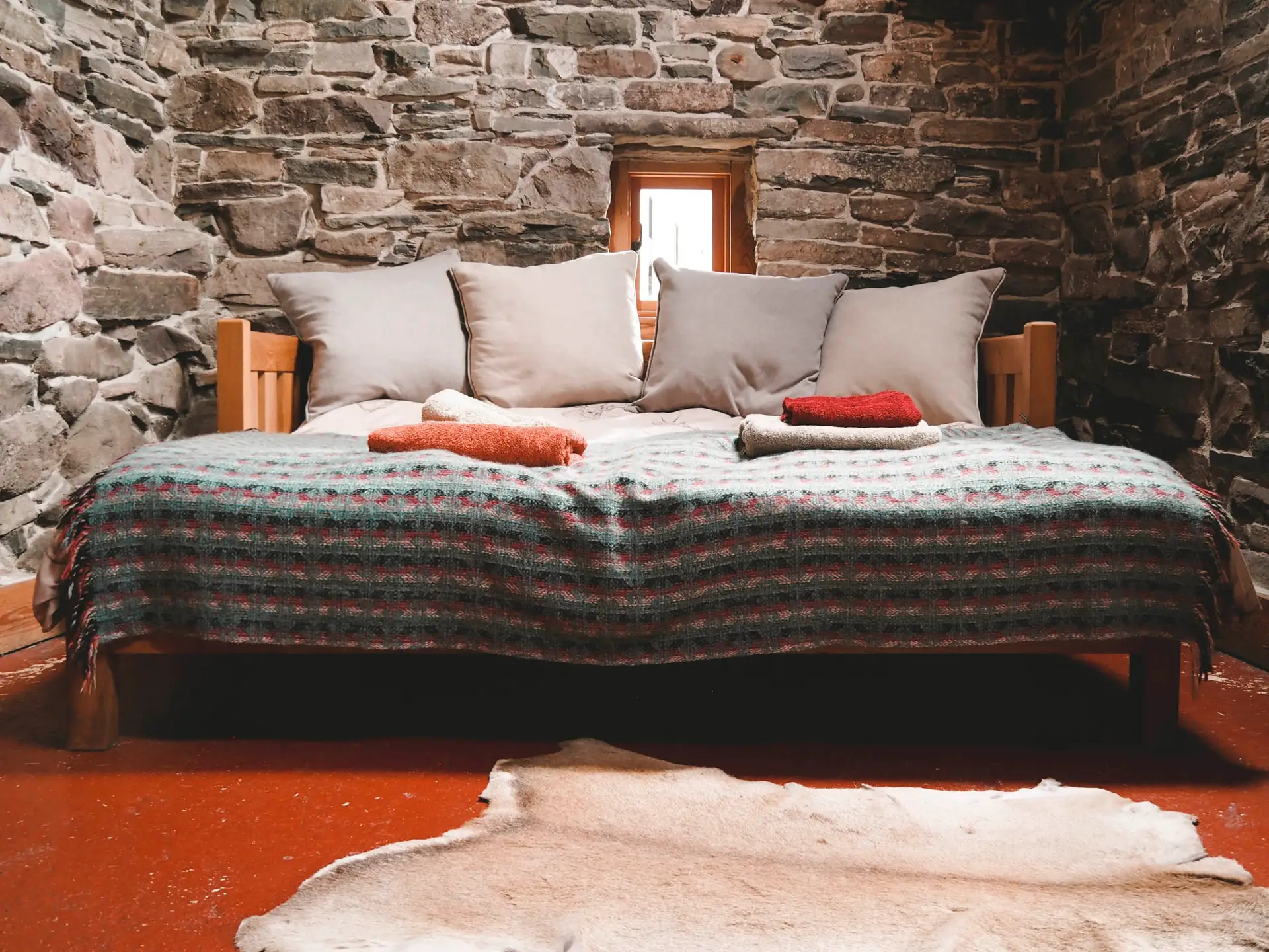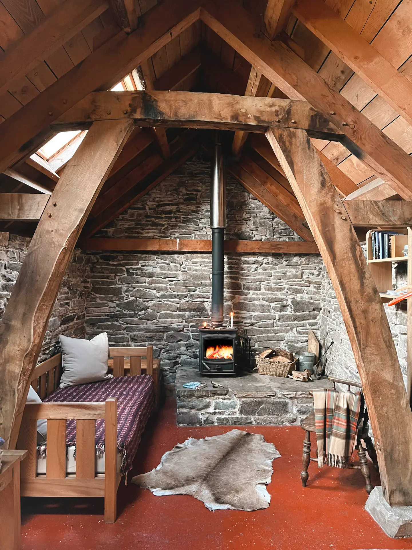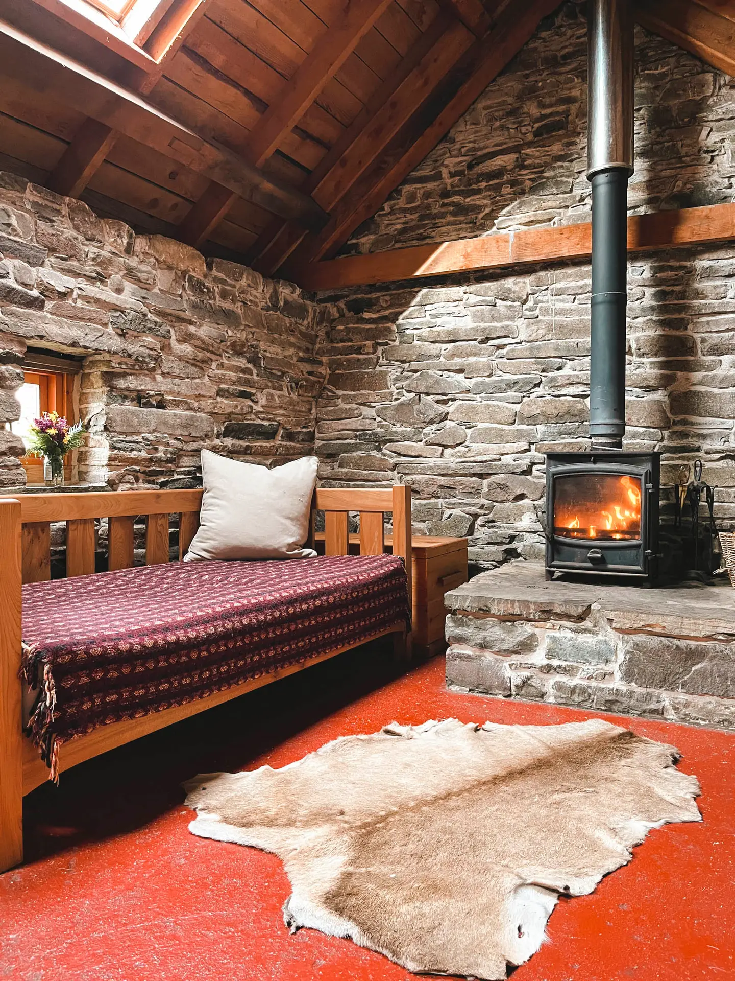 There are two rooms, each with 2 beds which can be placed together to make a double. Each room has a woodburning stove, a table, chairs and a blanket box. All the furniture (including the beds) has been beautifully made, in our own wood, by a local cabinet maker.